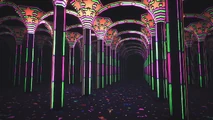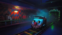 After exiting the purple spinning tent that contains the ring altar, Doug is put in a room with several roller coaster carts, one of which is on the tracks. Doug enters the cart and heads forward through a set of doors. The walls appear to be swirling, making Doug feel trippy. The cart moves downwards, before heading through another set of doors. Doug moves forward through a large room, where the Goliath Clowns are first introduced, where they laugh and wave at Doug. Doug continues through a few more turns, before entering a room where the walls are a spiraling optical illusion. After a few more twists and turns, Doug stops and gets off the cart at the entrance to the Funhouse.