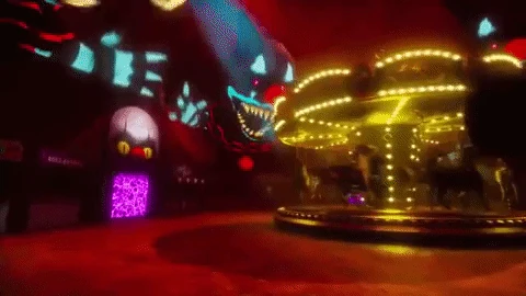 The Funhouse is the second zone in "Crazy Carnevil", containing the remaining 220 shards. Unlike the first zone, the Funhouse does not have Clown Cars. Rather, there are 5 groups of 5 Clown Gremlins. The now frenzied Clown Gremlins wander around the area. When one spots Doug, all other Clown Gremlins of that group of 5 will be aware of Doug’s presence as said by a tip, will pursue Doug. It's wise to use Primal Fear when surrounded, as it can get Doug out of tricky situations. The Funhouse contains a long, outer ring with more rollercoaster tracks (though Doug has to be careful when collecting shards in the outer ring, as a roller-coaster cart with a Clown Gremlin will move along the tracks faster than Doug can boost and will kill Doug upon crashing into him), two ball pits, several rooms with cannon traps, a large mirror maze-like area (without the mirrors), and green portals that lead up to a smaller, second floor. When all the shards have been collected, the Clown Gremlins will despawn, and Malak will begin to pursue Doug. Once Doug reaches the Funhouse's exit portal, he is sent back to the spinning purple tent, where he can now obtain the fifth ring piece.
