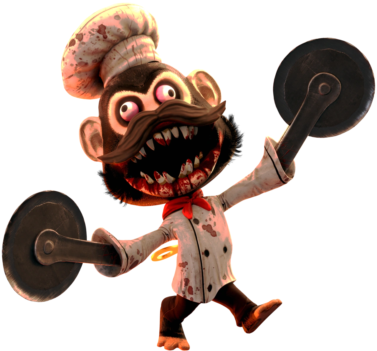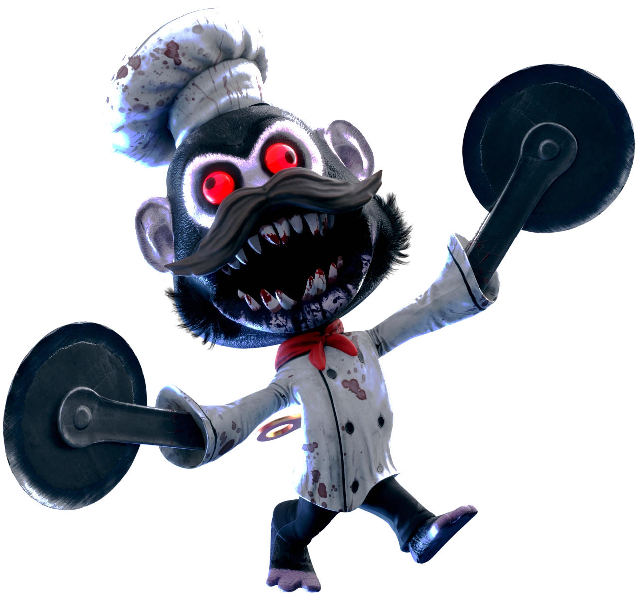 Chef Monkeys appear to be slightly larger versions of the Murder Monkeys, sporting a blood-stained chef's coat and toque, a red neckerchief, and a large brown handlebar mustache above their snout. Their knives have been replaced by giant blood-stained pizza cutters attached to metal stumps extending below their sleeves.