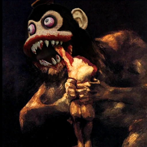 Much like their fellow monsters in the Dark Dimension, the Monkeys are unwaveringly loyal to Malak, aiding the demon lord in his endeavour to protect the ring pieces and keep his might eternal. It is likely that the Chef Monkeys are the immediate superiors of the Murder Monkeys, being more sadistic, deranged, and bloodthirsty than the rest. As chefs, it is possible that they are cannibals in real life, using their expertise in their new form to share the joy of feasting on their victims with the other monkeys. A painting showing a Murder Monkey's face superimposed on "Saturn Devouring His Son" is likely meant to showcase their cannibalistic tendencies.