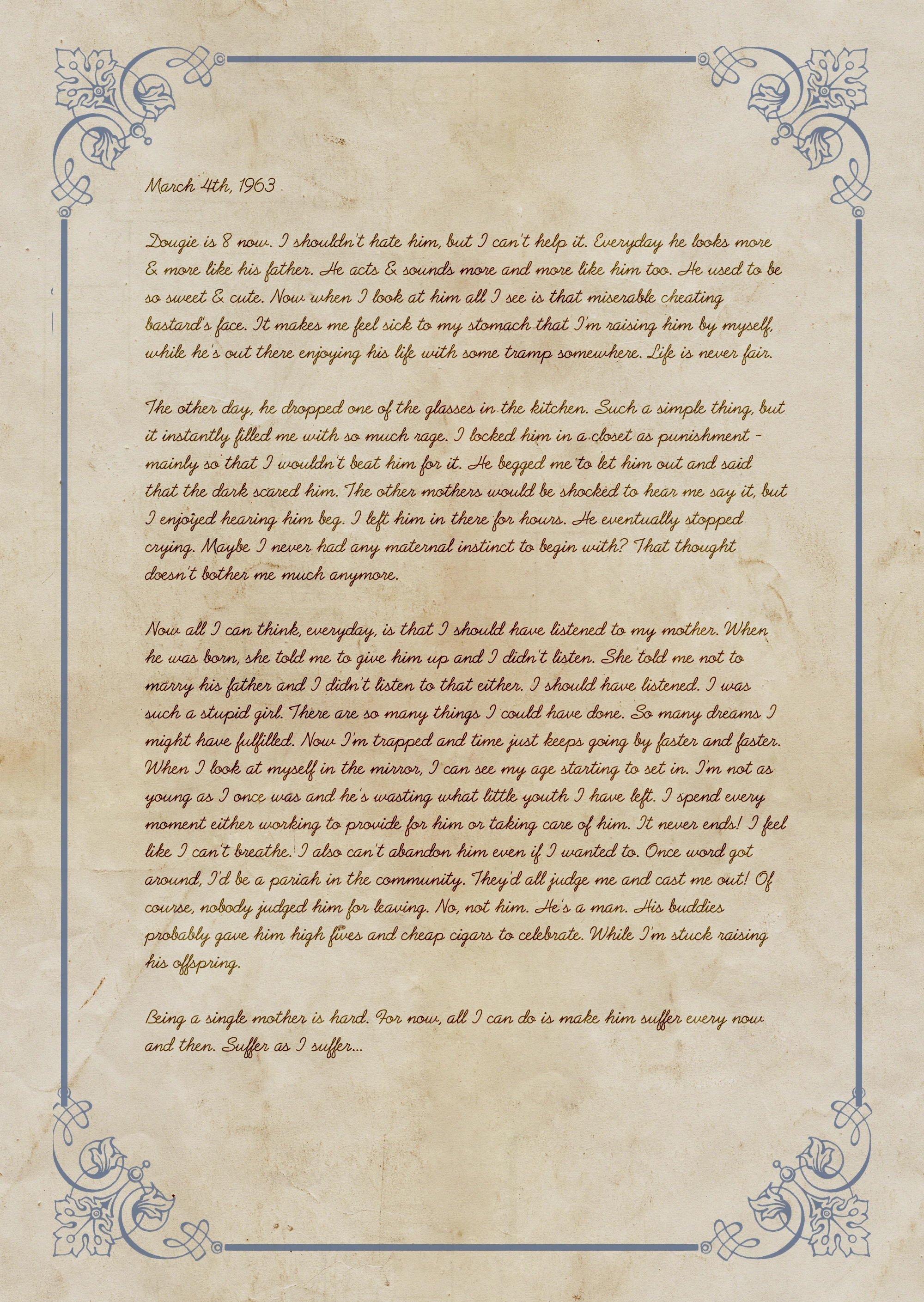 She was living near a large horse farm in central Pennsylvania. Before or after Doug's mother gave birth to him, her husband left them. She tried to take care of her son alone, but she felt tired day by day. She began to see her son as his father's brat, a life-draining being left to her. She began to hate him as his appearance and behaviors became more and more like his father's, but she couldn't leave him because it was against the law. She had begun to mistreat Doug; kept him in the dark for hours, said she enjoyed hearing him beg, heavily implying she gets some sort of sadistic gratification of mistreating Doug and making him fear her.