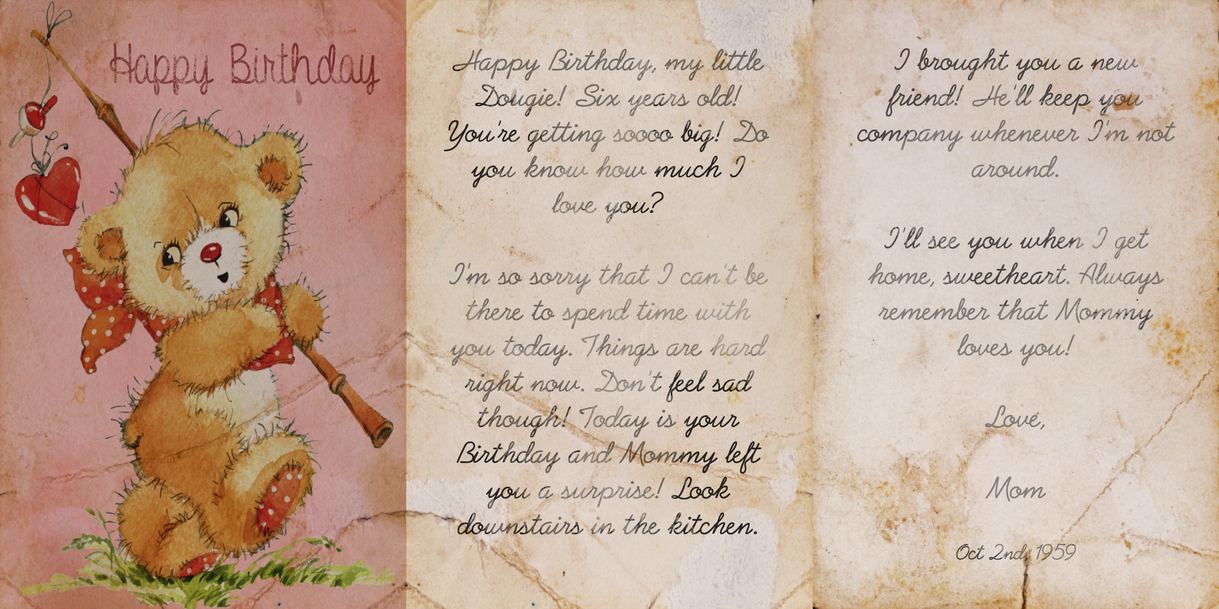 Happy birthday my little Dougie! Five years old! You're getting so big! Do you know how much I love you? I'm so sorry that I can't be there spend time with you today. Things are hard right now, so Mommy has to work. Don't feel sad though! Today is your Birthday and Mommy left you a surprise! Look downstairs in the kitchen. I bought you a new friend! He'll keep you company whenever I'm not around.