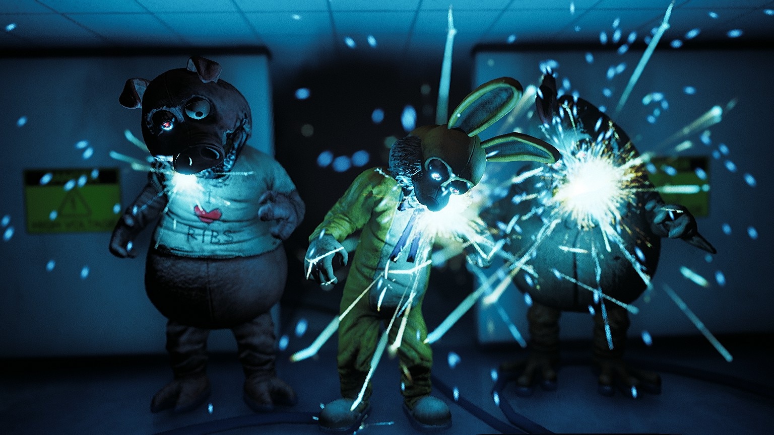 Hangry and his cohorts approach Doug as he opens the fuse box, with Hangry comically questioning why Doug is pressing the power button. Before they can kill him, Doug uses the fuse box to electrocute the trio, heavily damaging and incapacitating them. As Doug leaves to enter Zone 3, the mascots' eyes follow him, indicating they are far from finished.