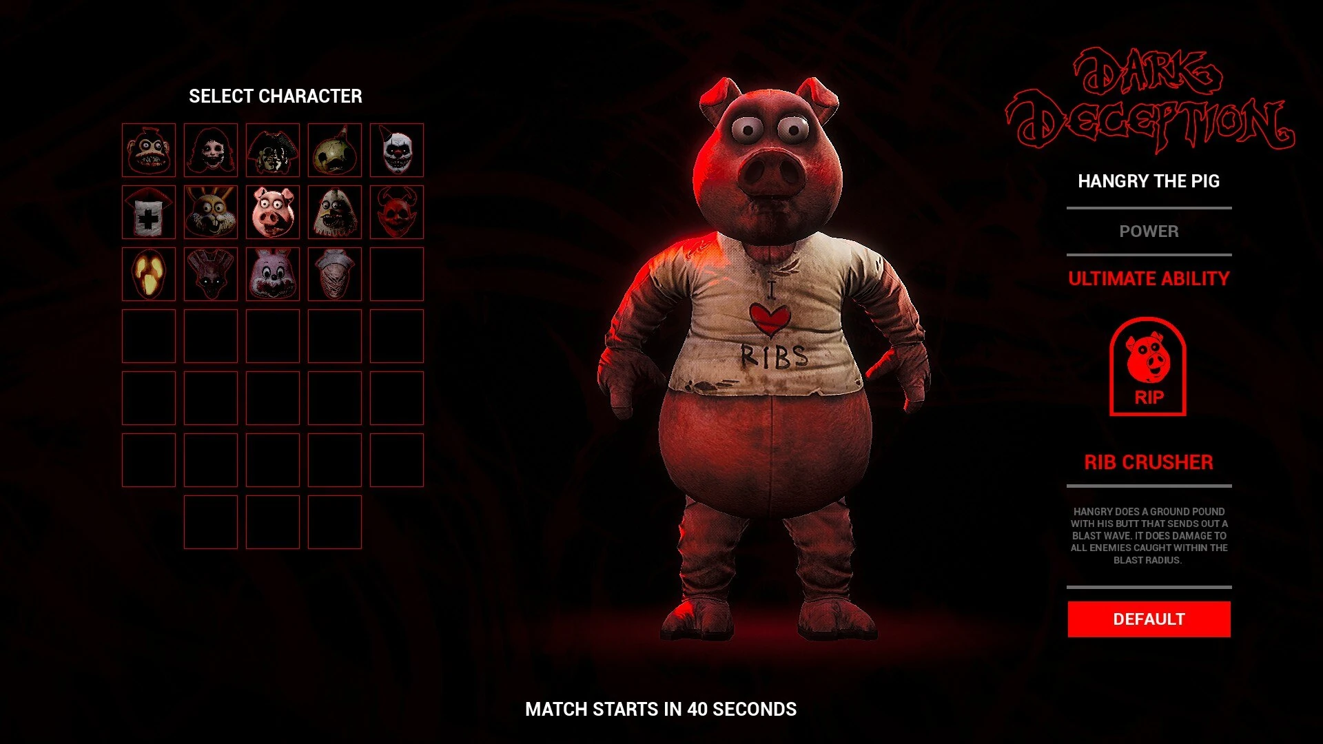 His ultimate ability, "Rib Crusher," when used, will make Hangry do a ground pound onto the floor, sending a blast wave that deals 120 damage. Since it takes 2 seconds to take effect, it is best used when an enemy cannot dodge it or right next to one. It can also go through walls of the mazes because of the shockwave.