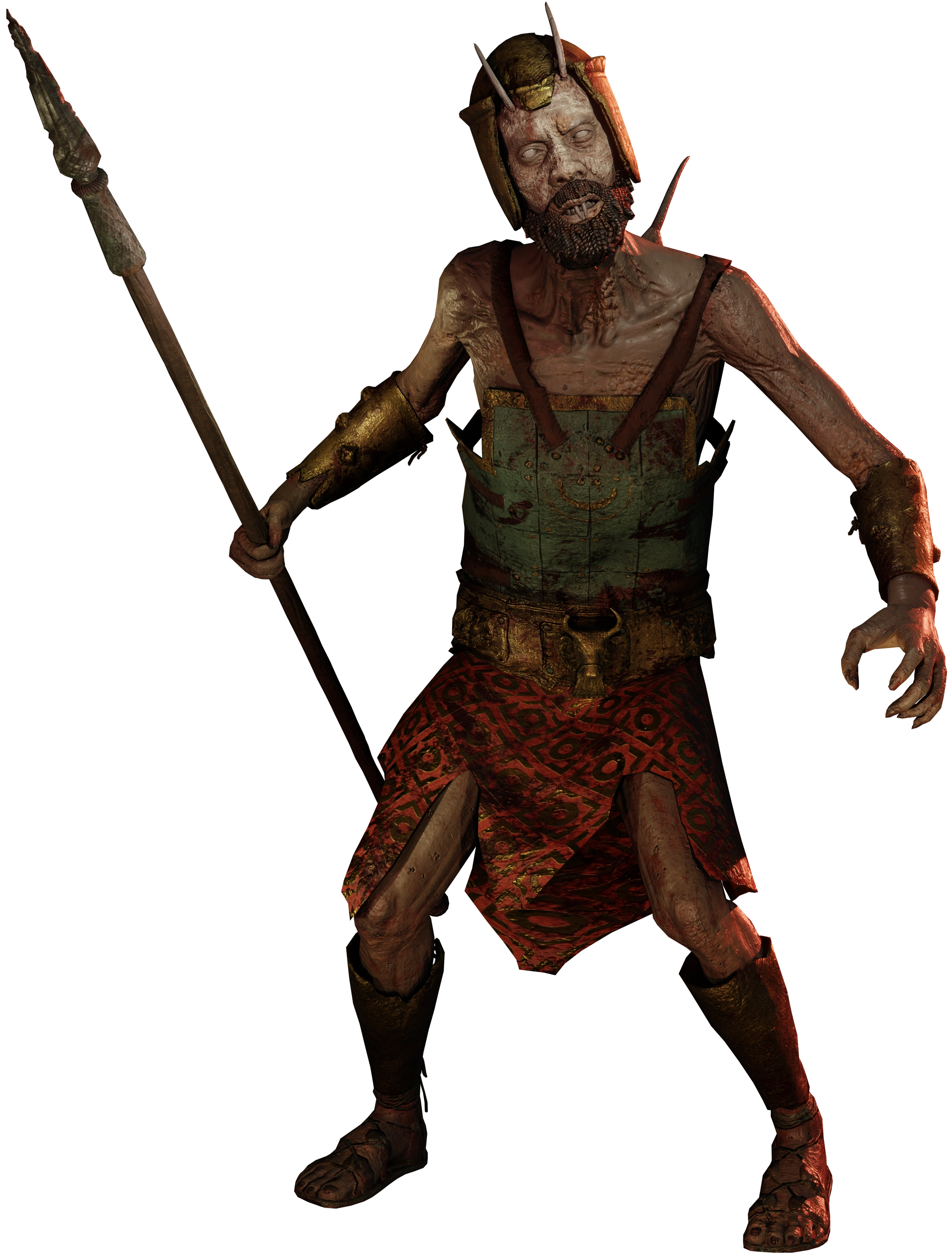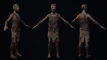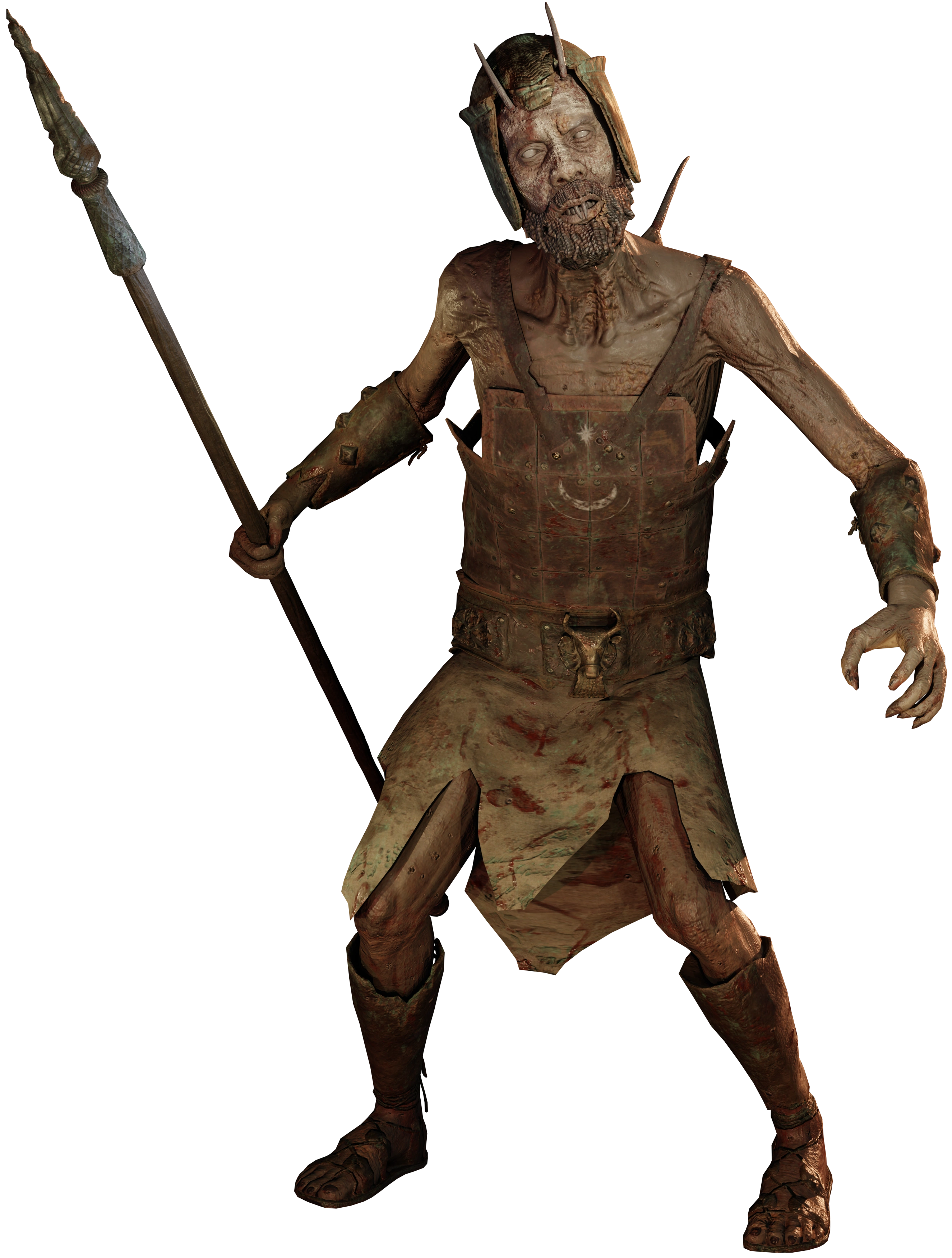 Balathu wears the standard garb of an Akkadian soldier, minus the half-faceplate. He wears studded leather armor and a helmet, and carries a spear. He has a postiche beard. His eyes are pale along with his skin because of his infection.