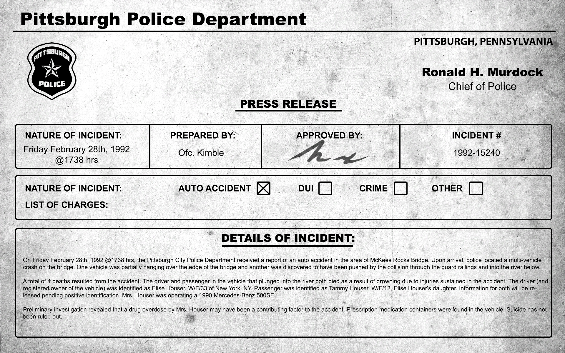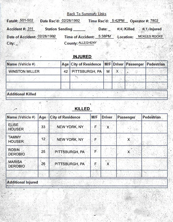 On Friday February 28th, 1992 @1738 hrs, the Pittsburgh City Police Department received a report of an auto accident in the area of McKees Rocks Bridge. Upon arrival, police located a multi-vehicle crash on the bridge. One vehicle was partially hanging over the edge of the bridge and another was discovered to have been pushed by the collision through the guard railings and into the river below.