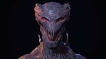 Alien Vampires are bipedal humanoids about 8 feet tall, remotely resembling bats. Their skin is dark gray smothered in excretion, while their wings and gills are dark pink. They display a large muscle mass, especially in their legs. They have four claws on the hands and three claws on the feet. Vampires have no eyes (but still possess eye sockets), which are replaced by three pairs of gills stretching to the back of the head. They also have two pairs of wings, with the main wings united with the arms and the small wings are in the middle of the back. Some parasite's tentacles stick out of the body as a few spines in the shoulder blades and a pair of elongated fangs in the top central incisor area of the mouth.